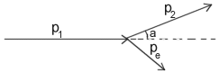 Liikemäärä säilyy: p1 = p2 + pe (huom. liikemäärä on vektorisuure!)Vektoreista päästään välittömästi eroon soveltamalla kosinilausetta yllä olevaan kolmioon: