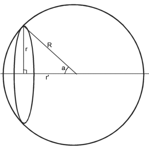 Tässä p on aineen tiheys (vakio), r on integroitavan sylinterin säde, h on pallonkuoren paksuus (vakio) ja dr on sylinterin korkeus (huom. dr ei ole suora vaan kaari, sillä pallon pinta on kaareva. Tästä syystä se saadaan helposti laskettua radiaanin määritelmän avulla: dr = R * da. Kun tämän lisäksi lausutaan vielä r = R sin a, niin saadaan integraali muotoon: